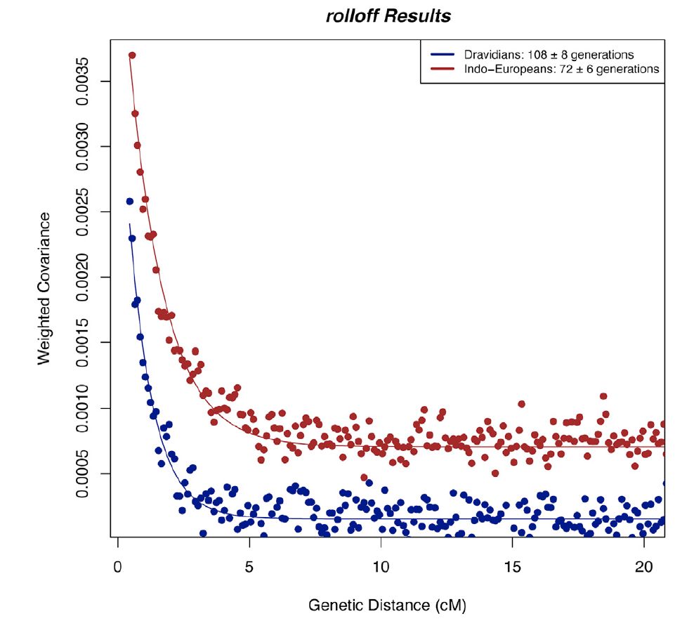 Another important result from the paper is the difference in the date of admixture for Dravidians (108 generations or 3,132 years) and Indo-Europeans (72 generations = 2,088 years).